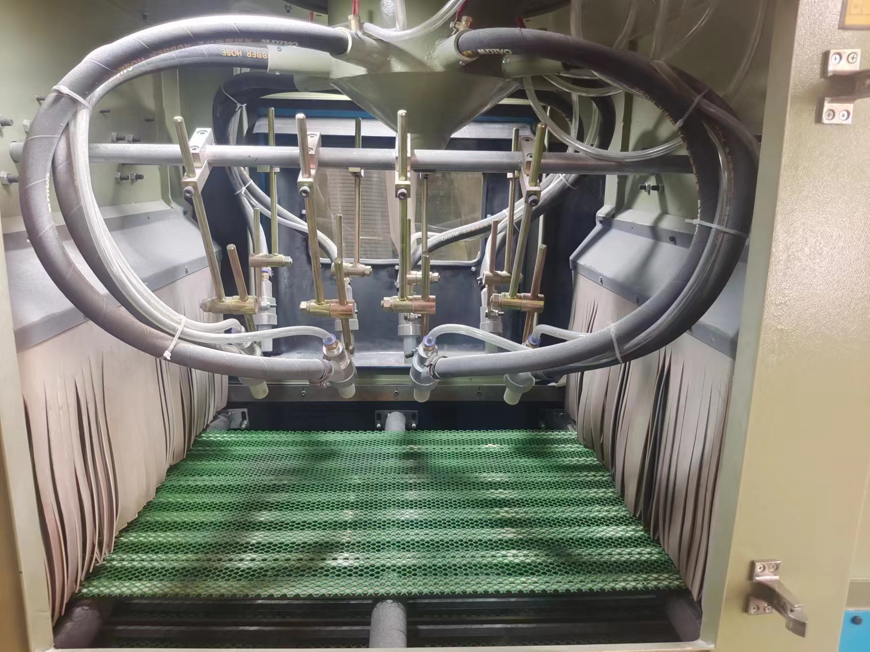 2、 本機采用履帶輸送、電機變頻調(diào)速,控制加工速率;2排聯(lián)動噴槍組勻速搖擺、槍咀方 向可調(diào),可多角度高效覆蓋噴砂面;